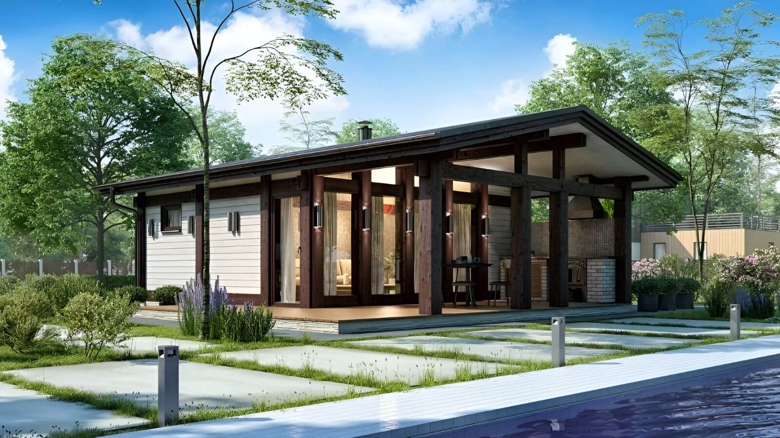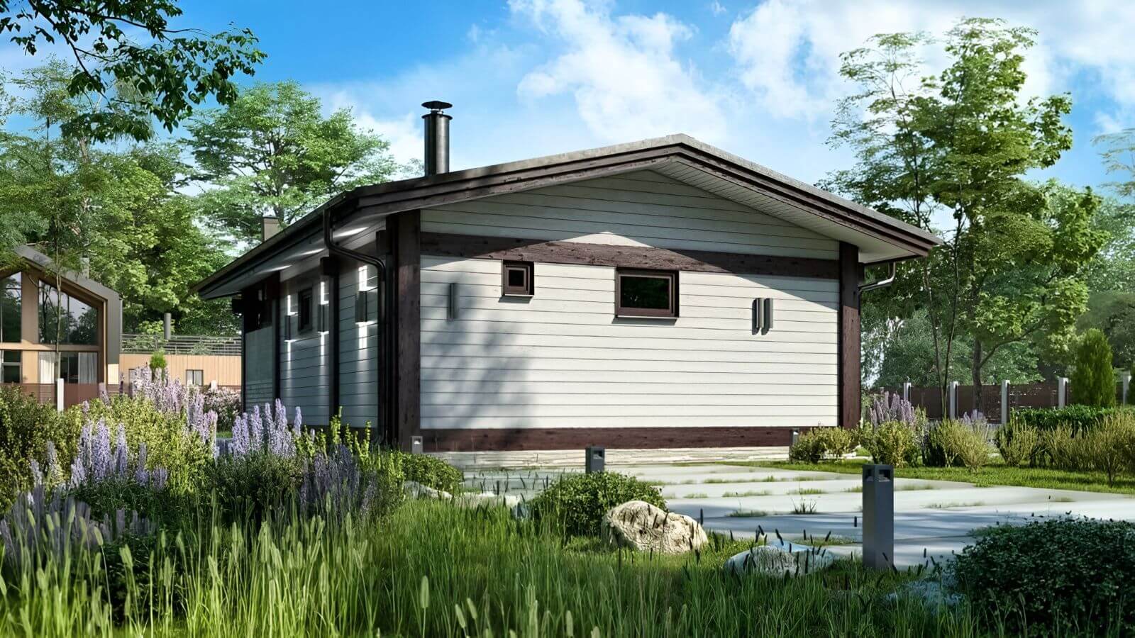 Выполнена в технологии фахверк, с панорамным остеклением, которое обеспечивает максимальное естественное освещение. В отделке фасада использован клееный брус с акцентными темными конструкциями и светлыми панелями, что подчеркивает геометрию строения и делает его визуально легким. Общая площадь постройки составляет около 54 м², из которых 39 м² — отапливаемые помещения. Функциональная планировка включает гостиную с кухонной зоной и обеденным столом, парную, душевую, санузел и раздевалку. Главное преимущество — крытая терраса площадью 15 м² с встроенным барбекю, где можно отдыхать с друзьями или устраивать семейные ужины на свежем воздухе. Проект идеально подойдет для загородного участка или дачи. Его выбирают те, кто ценит сочетание уюта, эстетики и функциональности. «Бремен» отлично впишется как в природный ландшафт, так и в современный коттеджный поселок.-
