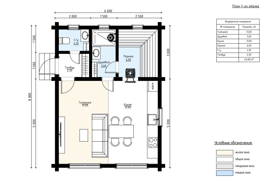 Общая площадь составляет 40 м², здание размером 6×8 метров включает гостиную (13 м²), кухню (13 м²), душевую (3,6 м²), парную (6 м²), санузел и тамбур. Жилая зона объединяет кухню и гостиную, создавая просторное помещение для отдыха и встреч. Мокрая зона представлена полноценным банным блоком. Фасад украшен крытой террасой, создающей уютное пространство для уединения или приёма гостей.