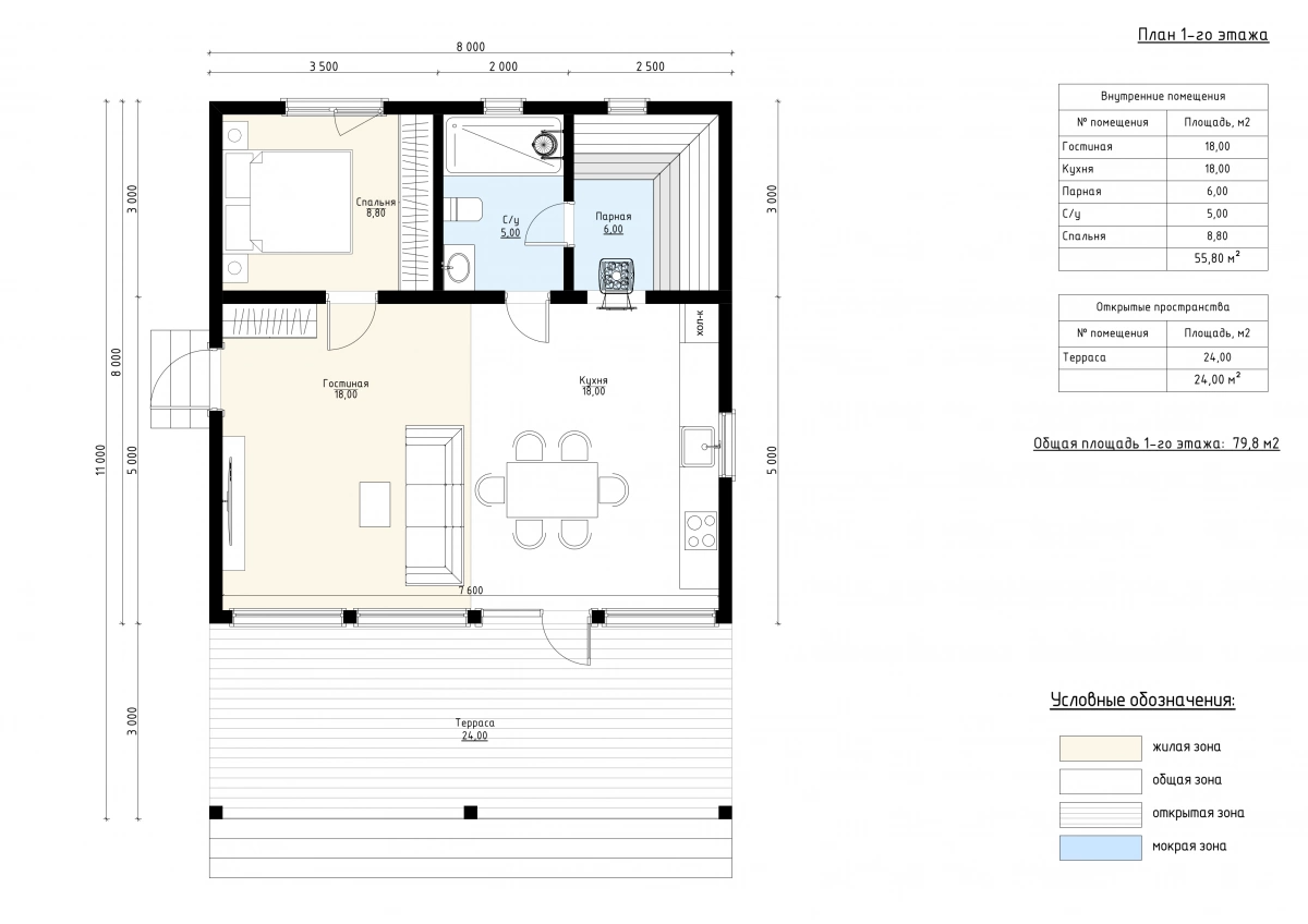 Внутри располагаются гостиная и кухня по 16 м² каждая, что позволяет собираться здесь большой компанией. Также предусмотрены спальня (8 м²), душ (5 м²) и парная (5 м²). В планировке чётко выделены жилая, мокрая и общая зоны, благодаря чему комфорт и функциональность находятся на высоком уровне.