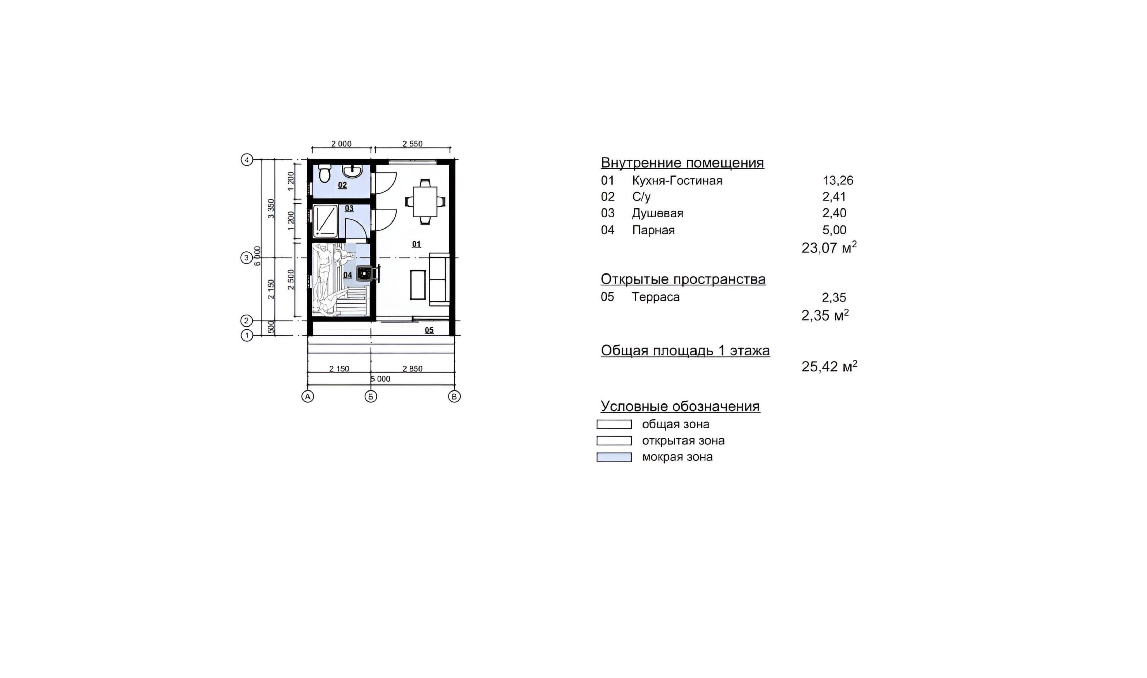 Общая площадь строения составляет 25 м², из которых более 23 м² приходится на внутренние помещения. Планировка включает просторную кухню-гостиную (13 м²), парную (5 м²), душевую и санузел. Внешнее пространство дополняет терраса площадью 2,3 м² — отличное место для отдыха на свежем воздухе.