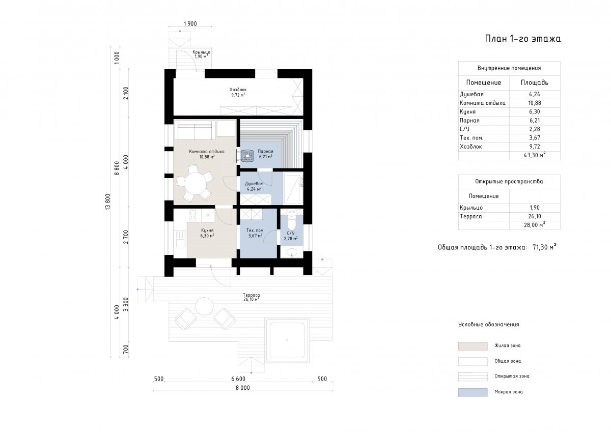 Общая площадь постройки составляет 112 м², включая просторную террасу 26 м² с зоной отдыха и возможностью размещения купели. Планировка продумана до мелочей: комната отдыха 11 м², кухня 6 м², душевая, санузел, техпомещение и парная площадью 6 м². Дополнительно предусмотрен хозблок 10 м² для хранения инвентаря и оборудования.