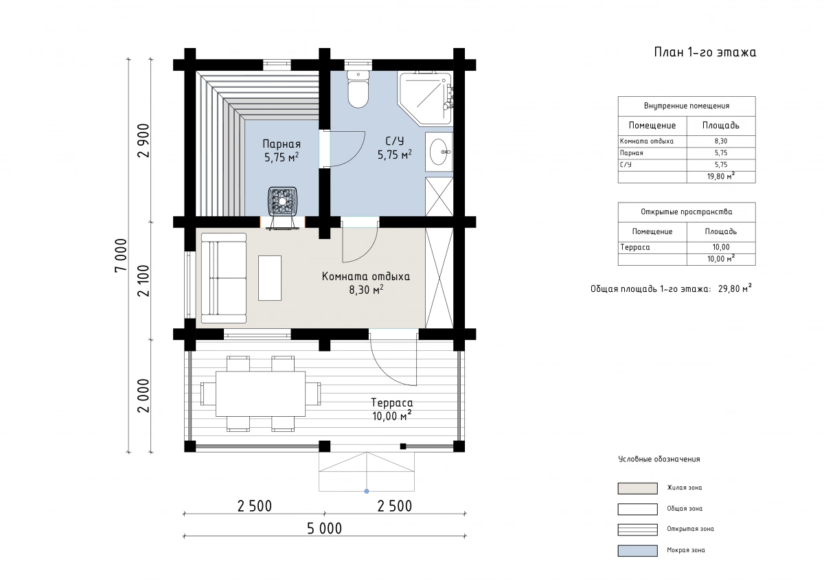 Планировка бани тщательно продумана для максимального комфорта. Общая площадь строения составляет 30 м², включая открытую террасу (10 м²). Внутри расположена комната отдыха площадью 8 м² — здесь можно разместить диван и небольшой стол для чаепития. Парная (почти 6 м²) и совмещённый санузел с душем (ещё 6 м²) обеспечивают полноценный функционал для банных процедур.