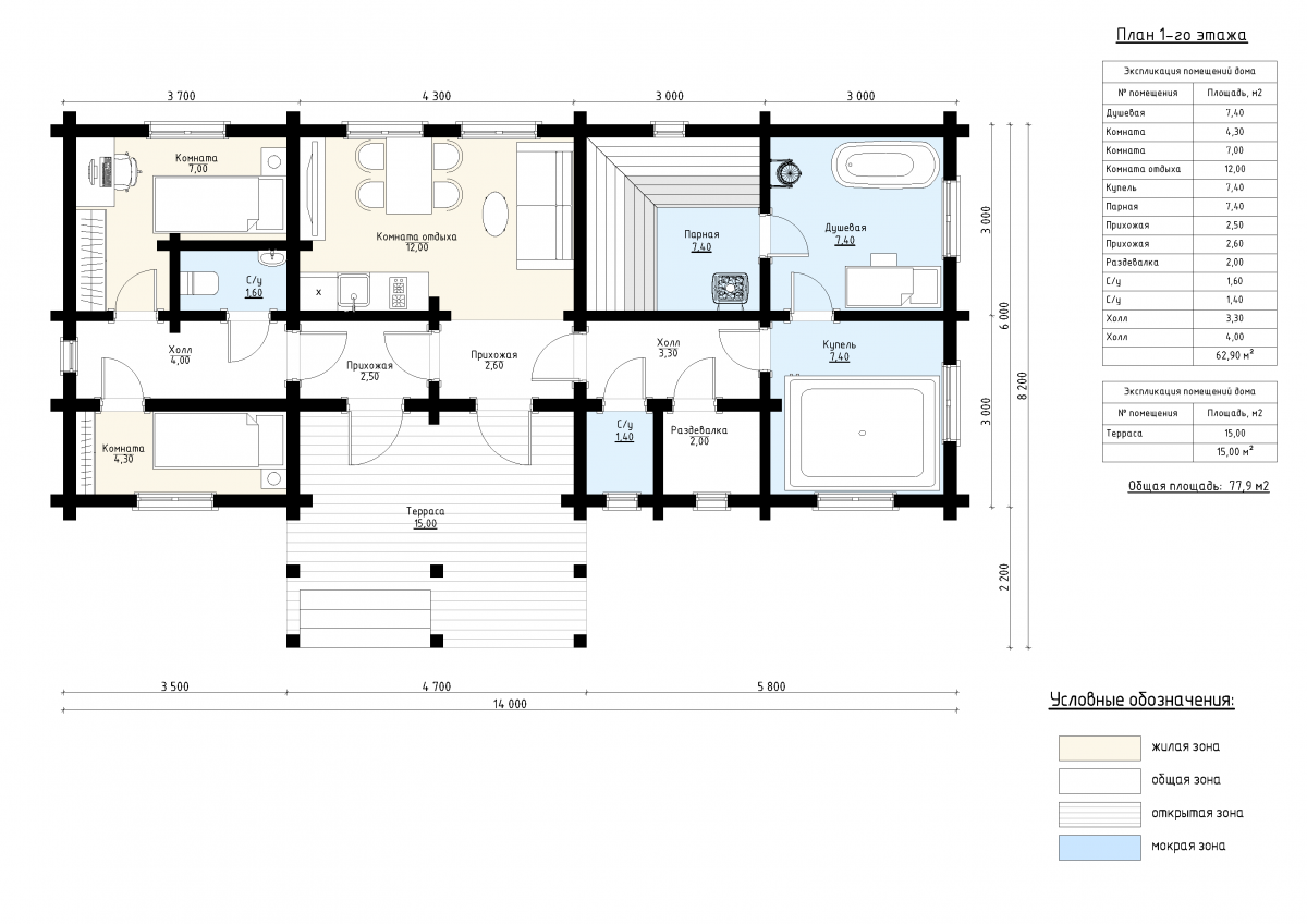 Просторная терраса площадью 15 м² с навесом делает здание особенно привлекательным для размещения рядом с бассейном или в ландшафтном парке. Общая площадь постройки — 78 м², включая жилую и открытую зону. Внутри продуманы все необходимые помещения: просторная комната отдыха (12 м²), две спальни, душевая (7 м²), парная (7 м²), два санузла и купель. Кроме того, предусмотрено техническое помещение и гардероб. Планировка выполнена в Г-образной форме, что позволяет зонировать пространства для сна, отдыха и банных процедур. Терраса плавно соединяет дом с окружающим пространством, создавая атмосферу уюта и приватности. Проект «Ванкувер» подходит для семейного отдыха, а также для сдачи в аренду в премиальном сегменте глэмпингов и спа-комплексов. Высокое качество материалов, визуально лёгкая архитектура и эффективная планировка делают этот проект оптимальным выбором для круглогодичного использования.
