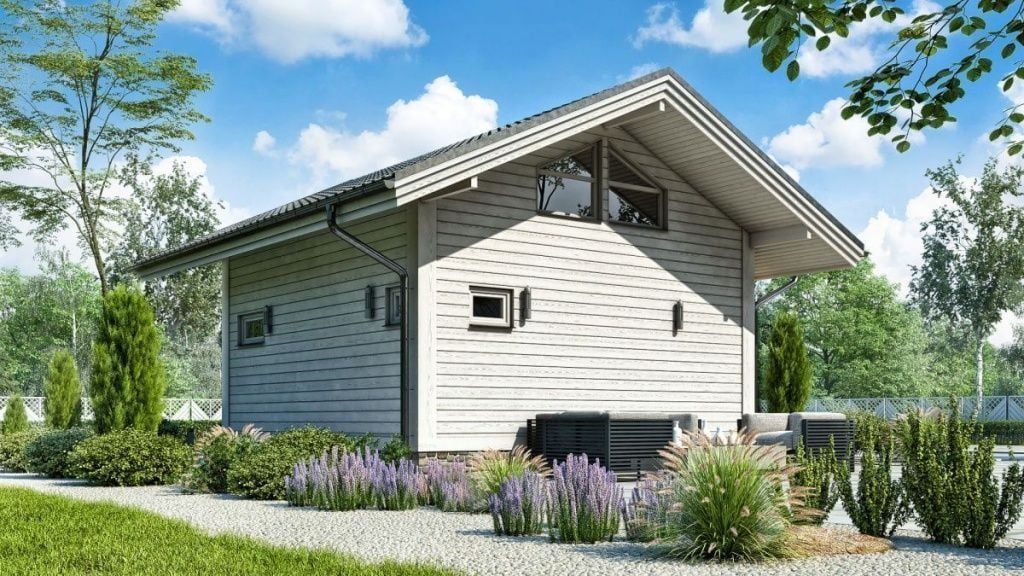 Элегантная баня из бруса «Дрезден» в современном скандинавском стиле площадью 30 м² станет отличным дополнением для загородного участка.