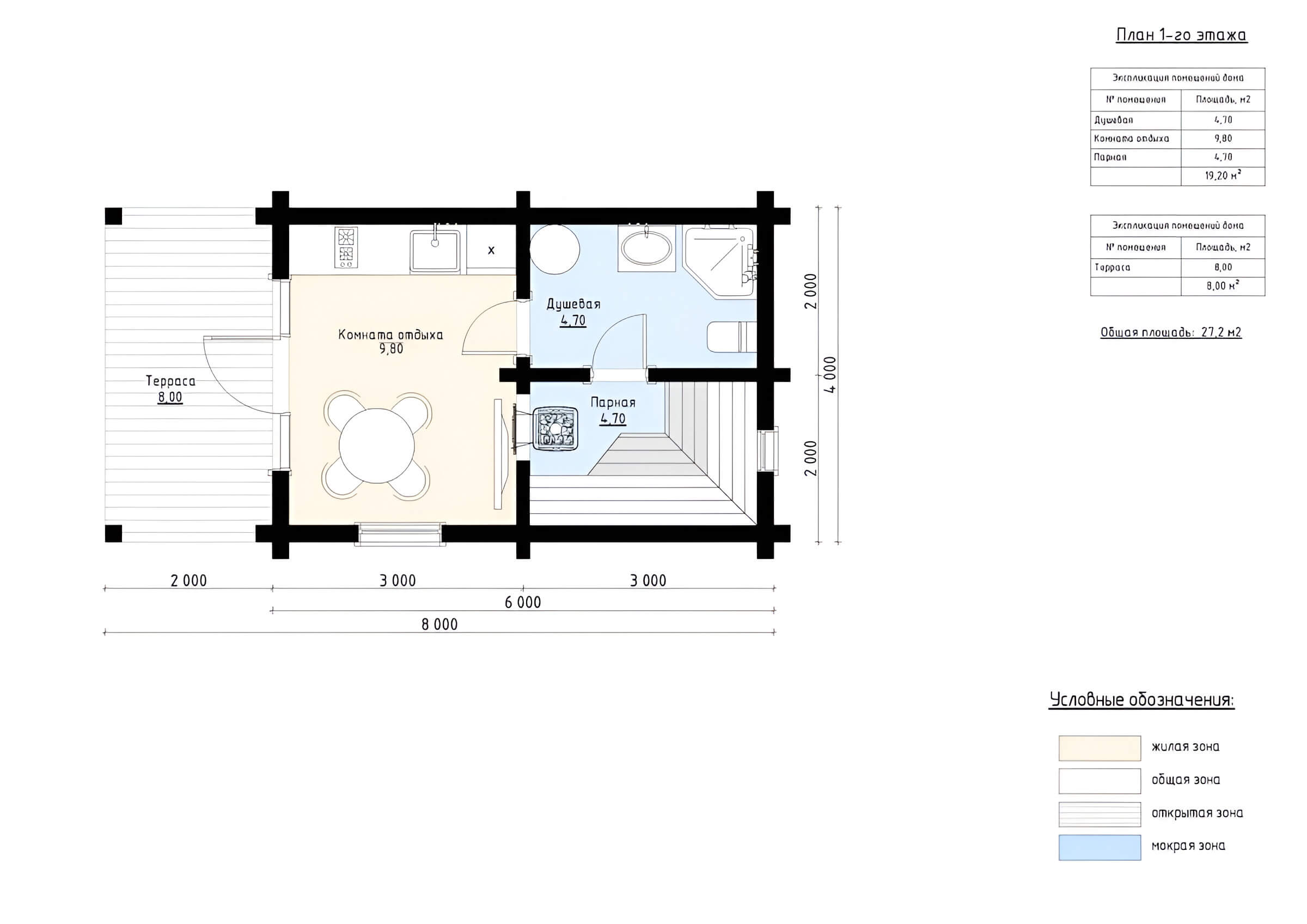 Здание площадью 27 м² выполнено из прочного профилированного бруса, обеспечивающего хорошую теплоизоляцию и долговечность конструкции. Натуральная фактура древесины гармонирует с каменным цоколем и крышей из мягкой черепицы, создавая тёплый и основательный облик. Функциональное зонирование включает: парную (4,7 м²), душевую (4,7 м²) и просторную комнату отдыха (9,8 м²), где можно разместить стол или диванную группу. Терраса площадью 8 м² находится под навесом и подойдёт для размещения гриля или вечернего отдыха на свежем воздухе. Благодаря продуманной планировке баня подходит для семейного использования или приёма гостей. Салерно — это компактное и стильное решение для тех, кто ценит комфорт, натуральные материалы и традиционную эстетику деревянной архитектуры.