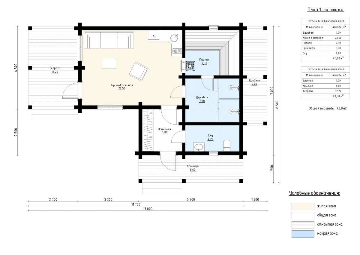 Финская баня из клееного бруса размером 14×15 м «Калгари» общей площадью 74 м² выполнена из клееного бруса, что обеспечивает прочность, долговечность и комфортное использование круглый год. Архитектурный стиль сочетает скандинавский минимализм и элементы современной классики, создавая уютную атмосферу. Внутренние помещения занимают 46 м² и включают: Кухню-гостиную площадью 22,5 м² — для семейных обедов и встреч с друзьями, Парную 7, 5 м² — для полного расслабления. Душевую 7 м² и санузел 4 м² — для удобства и гигиены. Прихожую 5 м² — для комфортного входа в дом. Дополнительно проект включает: Террасу 12 м² — идеальное место для отдыха на свежем воздухе. Проект «Калгари» создан для тех, кто ценит гармонию с природой, функциональность и стиль. Он станет прекрасным выбором для загородного отдыха, предоставляя уютное пространство для релаксации всей семьей или в кругу друзей.