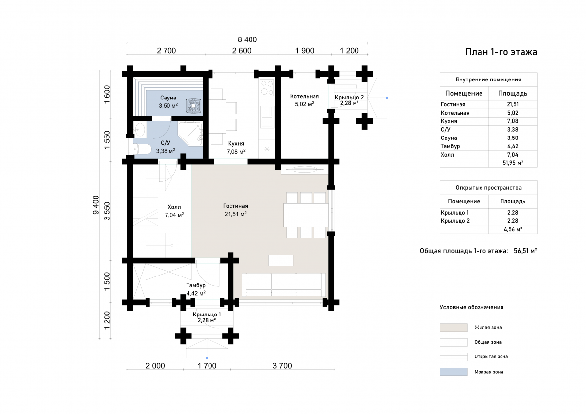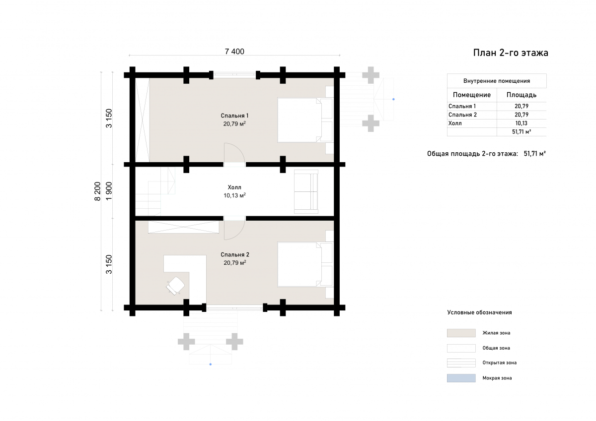 Классический стиль фасада с симметричной крышей, светлым деревянным тоном и аккуратными деталями подчеркивает эстетику традиционного загородного дома. Дом выполнен из клееного бруса — прочного и экологичного материала с высокой теплоизоляцией и устойчивостью к деформации. На первом этаже расположены просторная гостиная (21 м²), кухня (7 м²), санузел, сауна, котельная и прихожая. Второй этаж отведен под зону отдыха с двумя спальнями по 21 м² и холлом. Такое решение обеспечивает четкое разделение на приватную и общественную зоны, комфортное как для постоянного проживания, так и для сезонного отдыха. Проект подходит для семей с детьми или пар, ценящих функциональность и компактность. Благодаря полноценной планировке Канкун может стать не только баней, но и комфортным домом выходного дня.