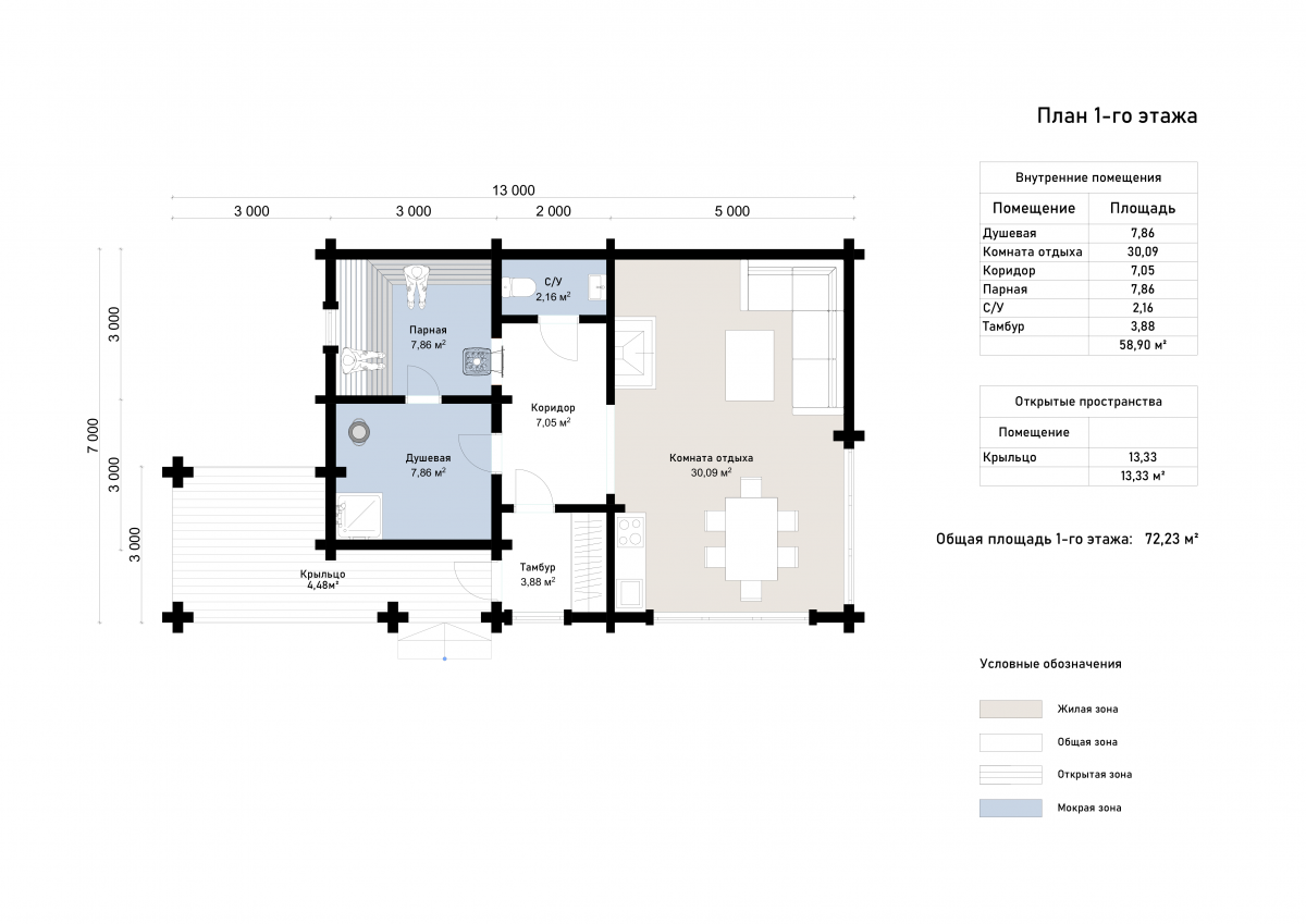 Фасад выполнен из экологически чистого клееного бруса, придающего строению благородный внешний вид и обеспечивающего долговечность конструкции. Натуральная текстура дерева и продуманная геометрия создают ощущение уюта и эстетической гармонии. Общая площадь первого этажа составляет 72 м². Просторная комната отдыха (30 м²) объединена с кухонной зоной, где с комфортом разместятся гости. Мокрая зона включает душевую (почти 8 м²), санузел и полноценную парную площадью 8 м². Такое зонирование делает баню максимально функциональной: здесь можно не только париться, но и проводить время в кругу семьи и друзей. Выход на крытое крыльцо площадью 13 м² позволяет наслаждаться свежим воздухом в любую погоду. Проект «Лайм» подойдёт тем, кто ценит уединённый отдых, но не готов жертвовать комфортом. Он отлично впишется как в дачный участок, так и в пространство рядом с загородным домом.