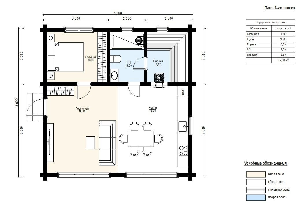 Планировка включает просторную гостиную и кухню по 18 м², совмещённые в одну открытую зону. Здесь удобно разместится мягкая мебель и обеденная зона. Также предусмотрена отдельная спальня площадью 9 м², что редкость для банных проектов такого формата. В мокрой зоне находятся душевая (6 м²), санузел (5 м²) и вместительная парная (6 м²) с выходом из зоны отдыха.