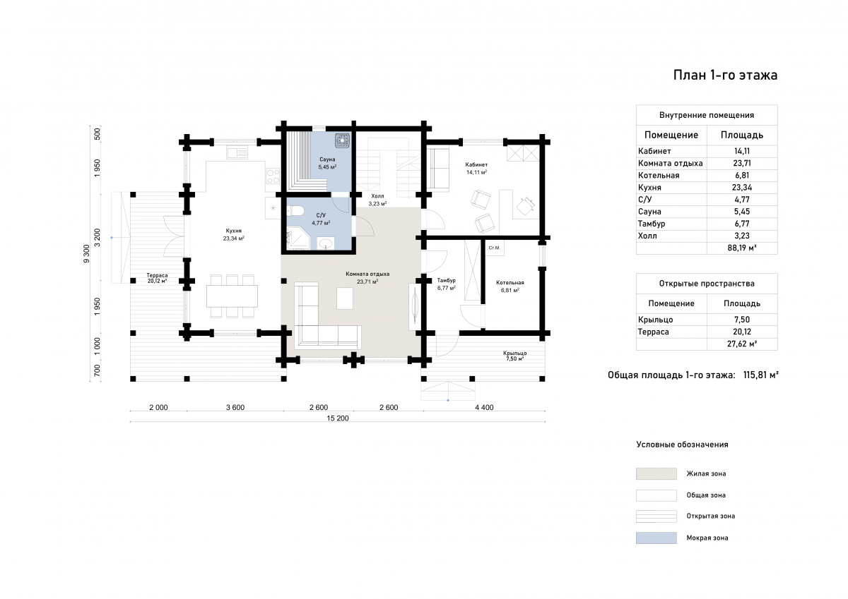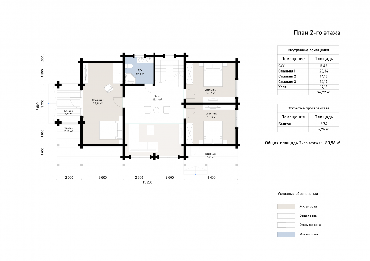 Общая площадь здания составляет 197 м². На первом этаже размещены просторная кухня-столовая (23 м²), гостиная (24 м²), сауна с душевой, санузел, котельная и кабинет. Также предусмотрены две открытые зоны — крыльцо и терраса. Второй этаж включает три спальни (по 14 м²), мастер-спальню (23 м²), холл, санузел и выход на балкон. Благодаря продуманной планировке, баня отлично подходит как для личного отдыха, так и для приема гостей.