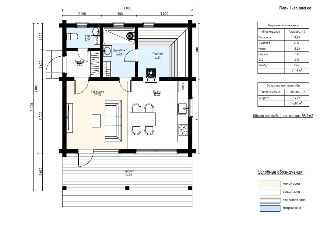 Общая площадь постройки составляет 55 м², а размеры — 7 на 9 метров. Благодаря просторной террасе (14 м²), домик идеально подходит для отдыха на природе в любое время года.