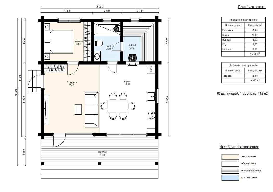 Общая площадь постройки составляет 72 м², включая открытую зону для отдыха.