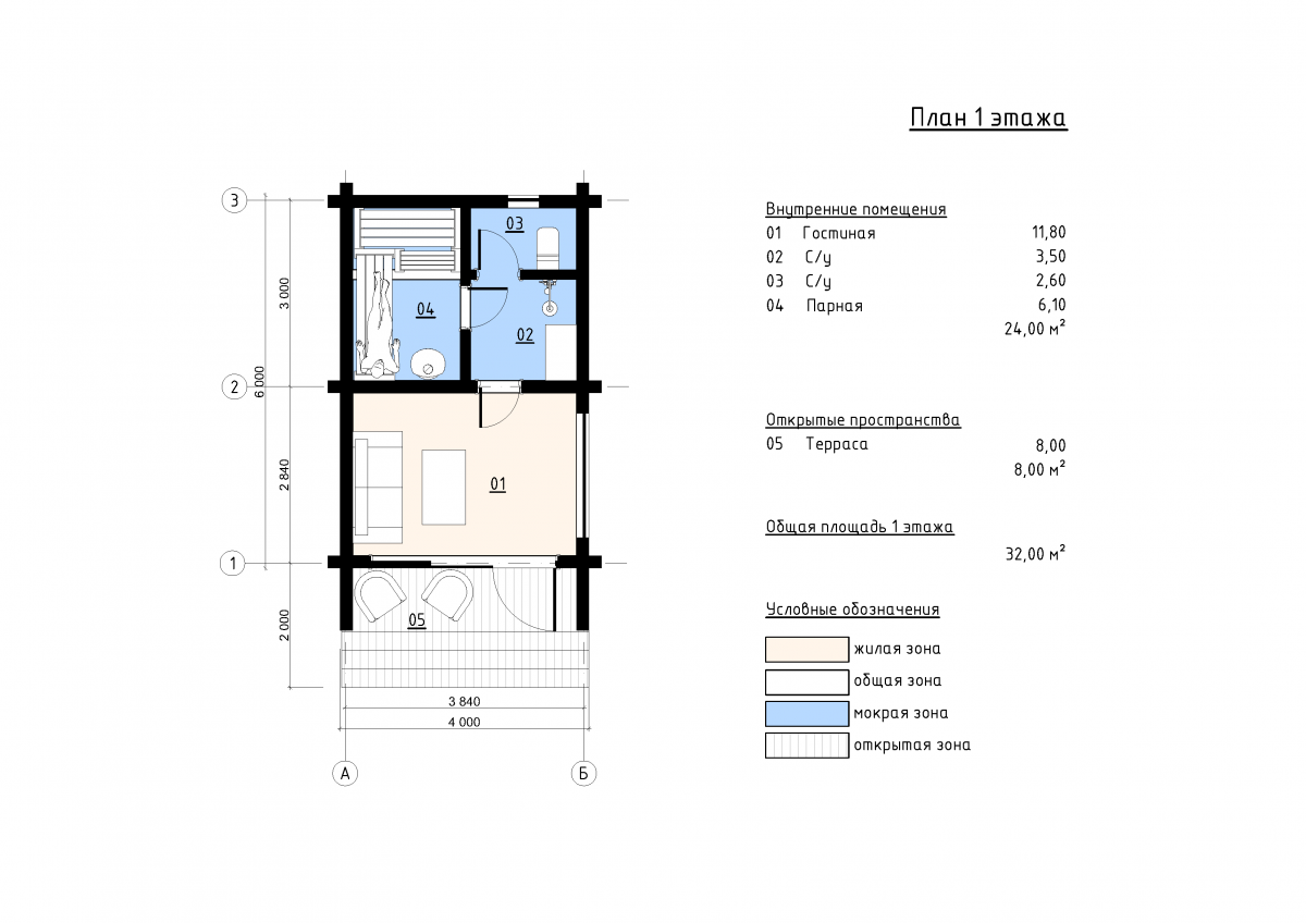 Площадь застройки составляет 24 м², из которых 11,8 м² занимает просторная гостиная с возможностью размещения обеденной группы и зоны отдыха. В мокрой зоне расположены душ и парная площадью 6,1 м². Также предусмотрены два отдельных санузла, что особенно удобно при размещении гостей. Терраса на 8 м² под общей крышей отлично подходит для утреннего кофе или вечернего отдыха.