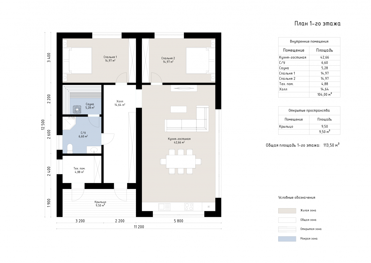 Общая площадь внутренних помещений составляет 104 м² и включает просторную кухню-гостиную площадью 43 м², две спальни по 15 м², сауну 5 м², санузел 7 м², техническое помещение 5 м² и холл 15 м². Открытое крыльцо площадью 9,5 м² идеально подходит для отдыха на свежем воздухе.