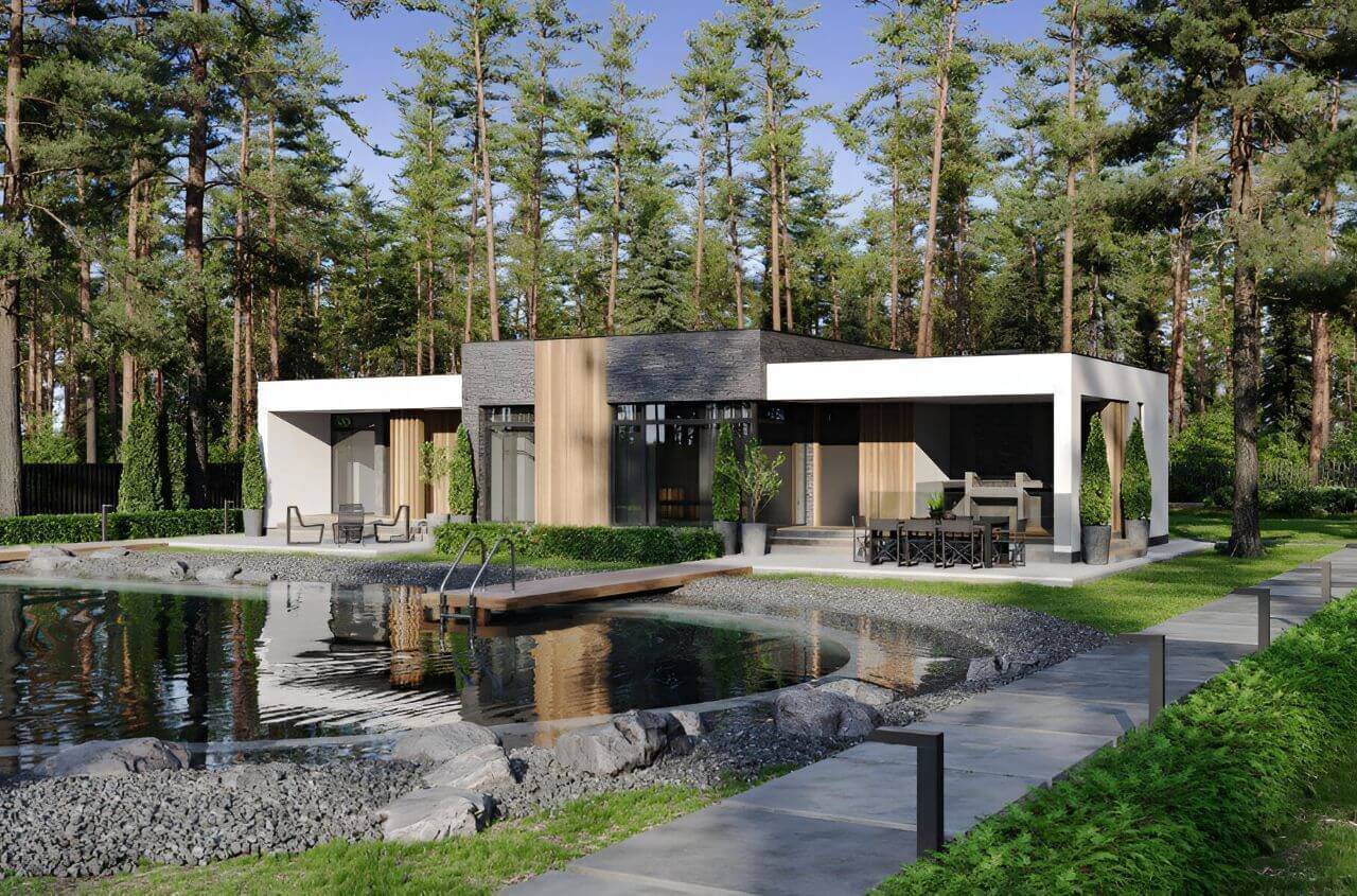 Прямые линии фасада, комбинирование натуральных текстур и панорамные окна создают минималистичный и элегантный облик. Просторная планировка и акцент на зону отдыха делают этот проект идеальным для любителей комфортного загородного времяпрепровождения. Внутренние помещения включают кухню-гостиную 35 м², бассейн 27 м², сауну 8 м², душевую и санузел, а также несколько комнат для отдыха и технические помещения. Просторная терраса 45 м² и прилегающая зона позволяют наслаждаться свежим воздухом и природой, делая отдых максимально уютным и расслабляющим. Проект «Орландо» подойдет для тех, кто ценит современную архитектуру, высокую функциональность и простор. Его универсальная планировка и стильный дизайн делают баню отличным выбором для больших семей или дружеских компаний, ищущих гармонию и комфорт в загородной жизни.- Бани под ключ