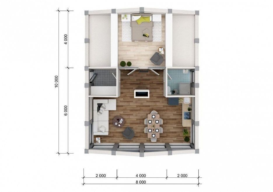 Увеличим или уменьшим площадь здания. Изменим расположение окон и дверей. Добавим санузел, ещё одну спальню для гостей, террасу и так далее