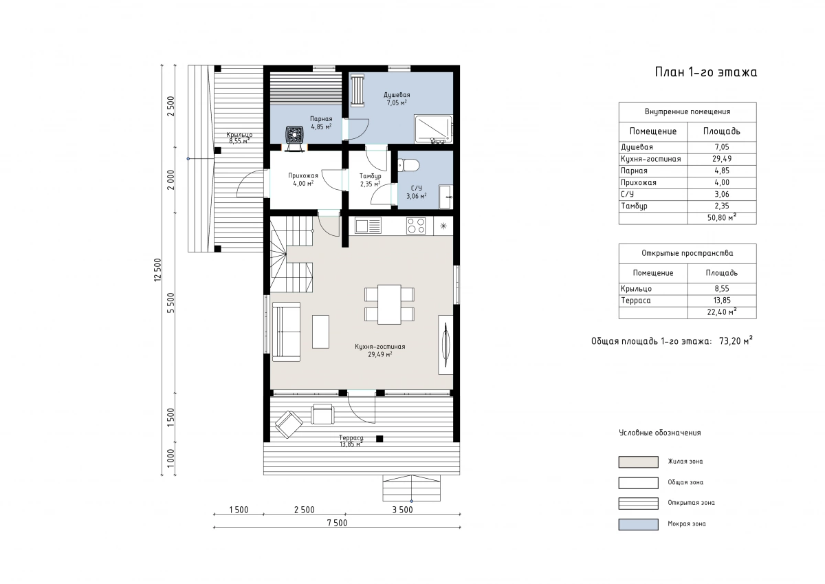 Просторная кухня-гостиная и зоны отдыха создают комфортное пространство, а панорамные окна наполняют дом светом и усиливают связь с природой. Внутренние помещения 101 м²: кухня-гостиная 29 м², парная 5 м², душевая 7 м², два санузла 8 м², спальни по 14 м², кабинет 6 м², холл и гардероб. Открытые пространства включают террасу 22 м², крыльцо 9 м², балкон 3 м². «Дублин» идеально подходит для семейного отдыха или проживания, сочетая уют, стиль и функциональность.