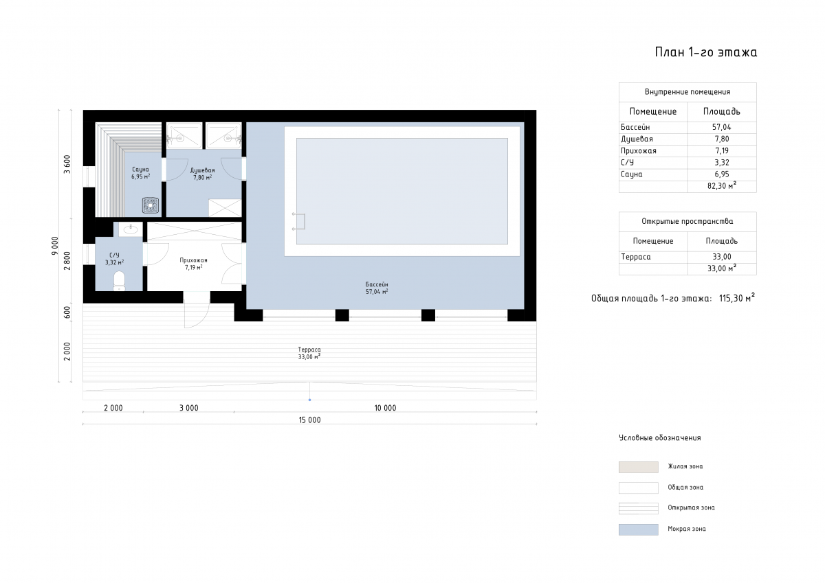 Внутренние помещения 82 м²: бассейн, сауна 7 м², душевая 8 м², прихожая 7 м², санузел 3 м². Открытая терраса 33 м² идеально подходит для отдыха на свежем воздухе.
