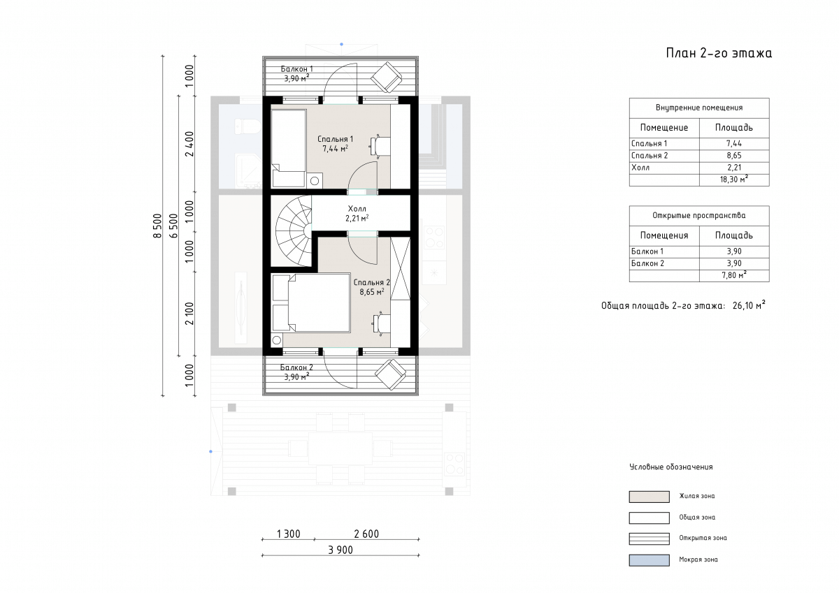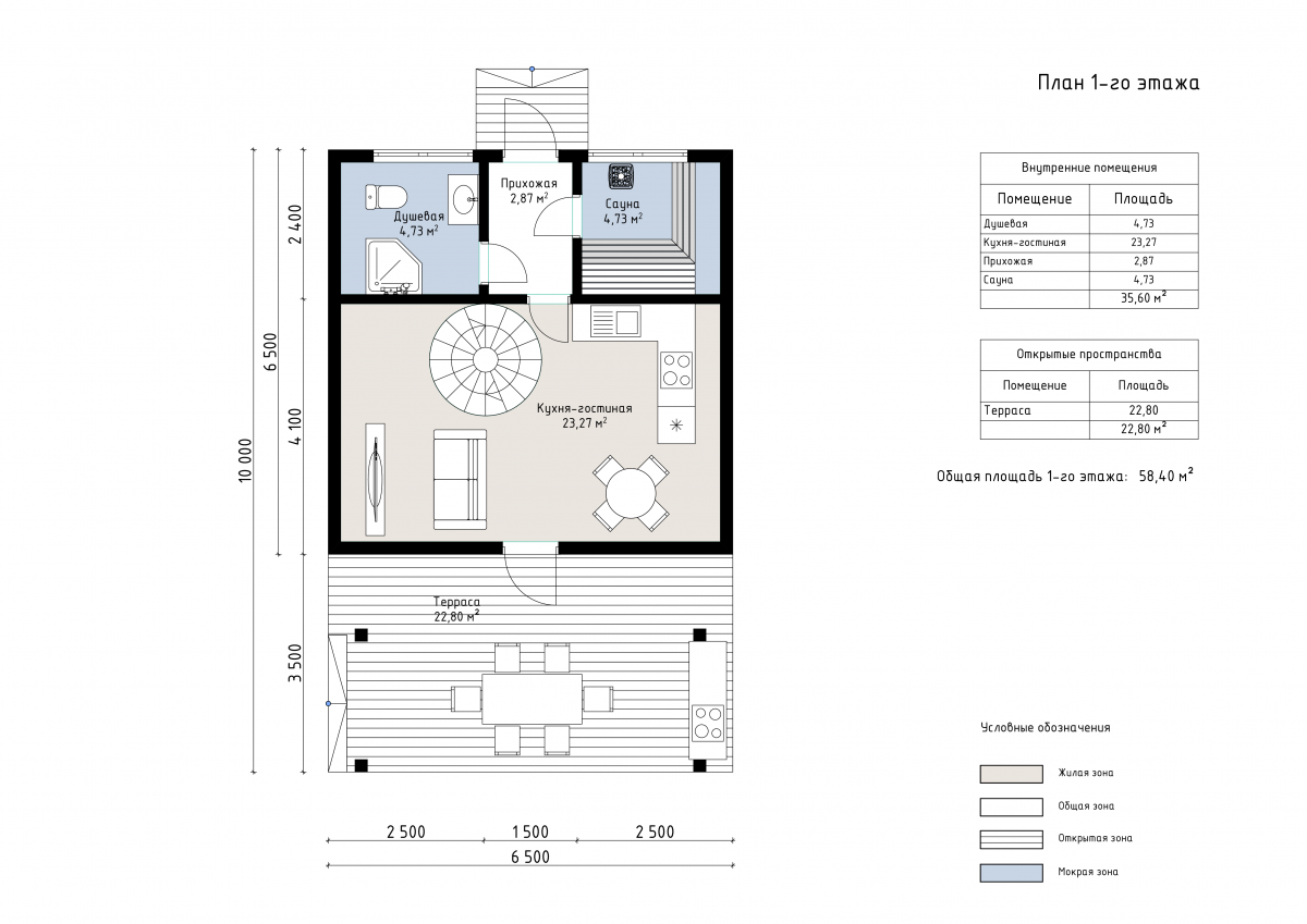 Дом выполнен в стиле A-frame с фасадной обшивкой из дерева и фальцевой кровлей, спускающейся до земли. Такой тип постройки отличается высокой энергоэффективностью и быстрым монтажом. Площадь первого этажа составляет 58 м², где расположены кухня-гостиная (23 м²), душевая, прихожая и парная. На втором этаже размещены две небольшие спальни и холл общей площадью 18 м². Из каждой спальни есть выход на собственный балкон. Дополнительным акцентом служит терраса площадью 23 м², украшенная деревянной перголой, что делает зону отдыха особенно уютной. Проект идеально подойдет для пары или семьи с детьми, ценящих стиль, комфорт и компактность. Это отличный выбор как для дачи, так и для аренды в глэмпинг-поселке.