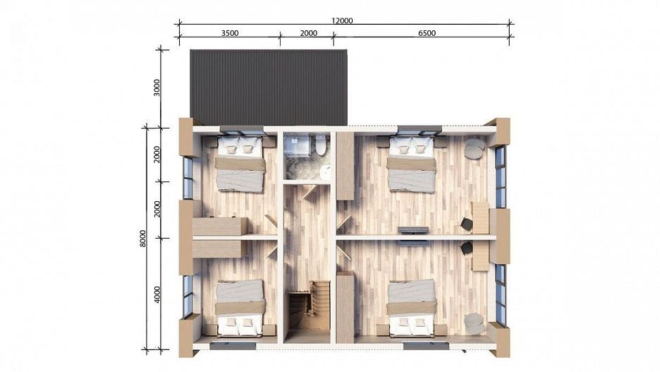 Баня Барнхаус Оснабрюк — двухэтажный проект в стиле минималистичного барнхауса, объединяющий простор и лаконичность. Выполнена по каркасной технологии, что обеспечивает энергоэффективность и долговечность. Размеры дома — 12 на 8 метров. На первом этаже расположены просторная кухня-гостиная, спальня, санузел и отдельный кабинет. Также предусмотрено крыльцо, кладовая и навес для автомобиля. Второй этаж занимает приватная зона: четыре спальни, общий санузел и вместительный холл. Проект идеально подойдёт для большой семьи, а также для загородного отеля с семейными номерами. Уют, современный стиль и функциональность — ключевые черты этого дома.- Бани под ключ