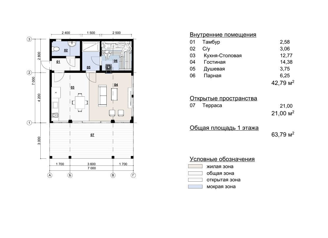 Просторная гостиная площадью 14 м² с панорамными окнами создает атмосферу уюта и открытого пространства. Кухня-столовая размером 13 м² позволяет комфортно разместить обеденную зону и место для приготовления пищи. В бане предусмотрена парная 6 м² и душевая 4 м², что делает процесс банных процедур максимально удобным. Санузел площадью 3 м² добавляет практичности. Просторная терраса 21 м² идеально подходит для отдыха на свежем воздухе и располагает к приятному времяпрепровождению в окружении природы.