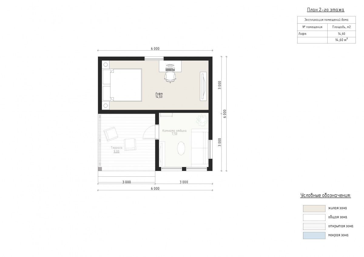 Внутренние помещения первого этажа занимают 21 м², включая комнату отдыха площадью 8 м², парную 5 м², душевую 6 м² и санузел. Второй этаж представляет собой лофт площадью 15 м², который можно использовать как зону отдыха или спальню. Открытое пространство в виде террасы на 9 м² создает комфортное место для общения на свежем воздухе.