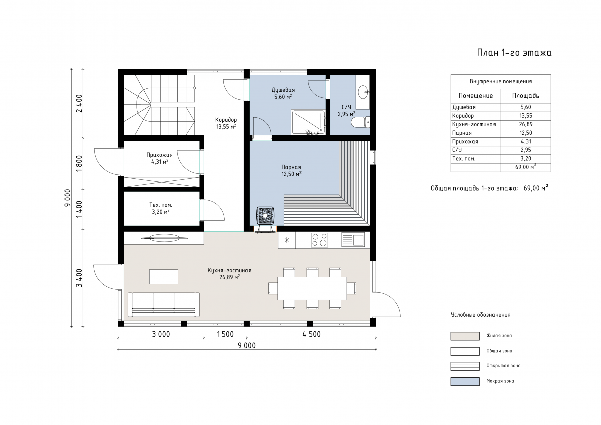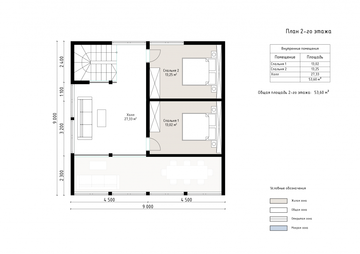 На первом этаже расположены кухня-гостиная площадью 27 м², которая объединяет зону отдыха и обеденную группу. Здесь предусмотрена удобная прихожая 4 м², техническое помещение 3 м², душевая 6 м² и санузел 3 м². Главным элементом банной зоны является просторная парная площадью 13 м², рассчитанная на несколько человек. Второй этаж занимает холл 27 м², создающий ощущение простора за счёт второго света. Две уютные спальни площадью 13 м² каждая позволят разместить гостей или использовать пространство для отдыха после банных процедур. Терраса 27 м² делает этот проект особенно привлекательным для загородного отдыха. Здесь можно разместить зону для релаксации, барбекю или купель.