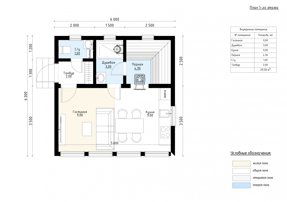 Внутренние помещения занимают 30 м², включая гостиную и кухню по 9 м², парную 5 м², душевую 3 м², санузел и небольшой тамбур. Просторные окна добавляют визуального простора, а фахверковый стиль подчеркивает изысканность архитектуры.