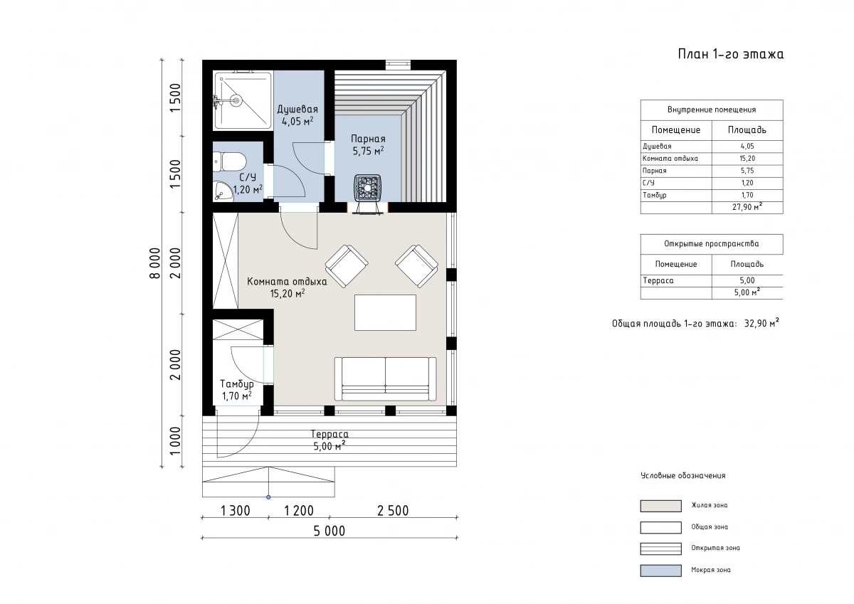 Общая площадь внутренних помещений — 28 м²: комната отдыха 15 м², парная, душевая, санузел и тамбур. Терраса 5 м² подходит для отдыха, наслаждения видами или вечернего чаепития.