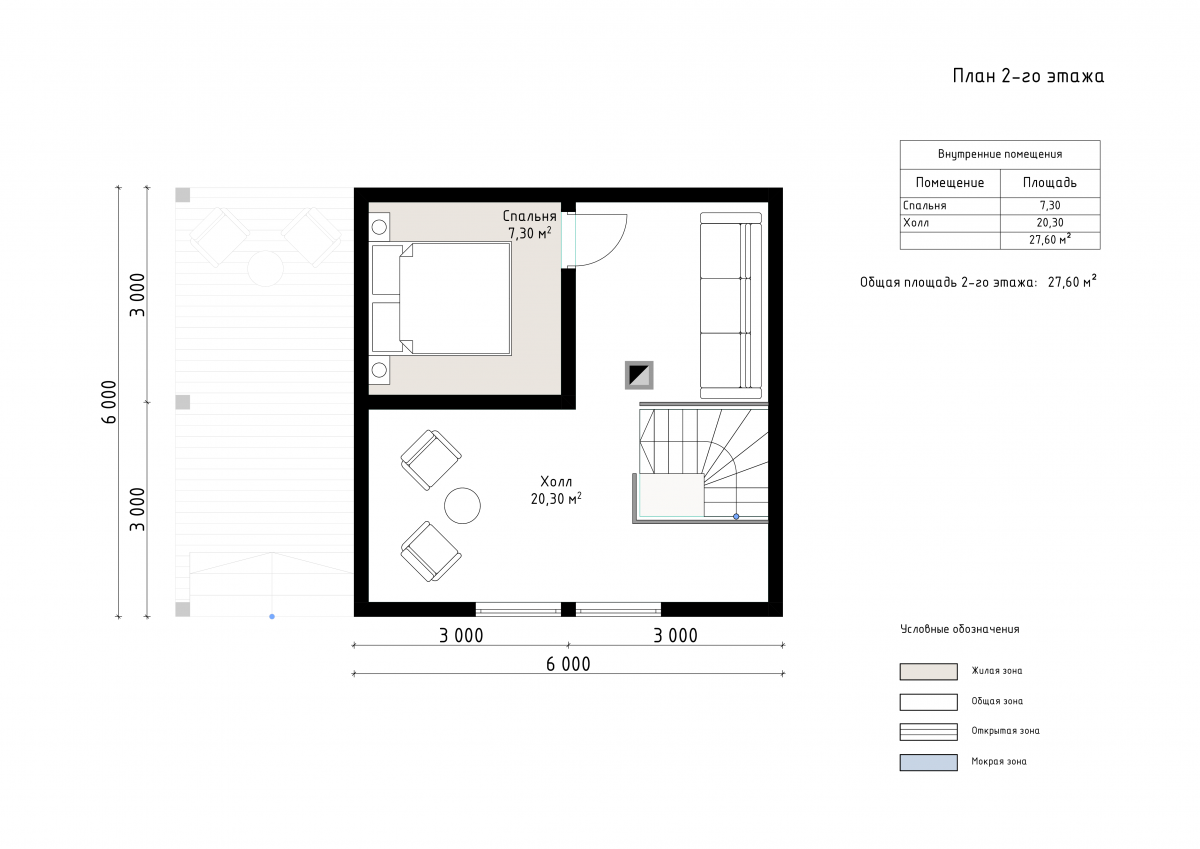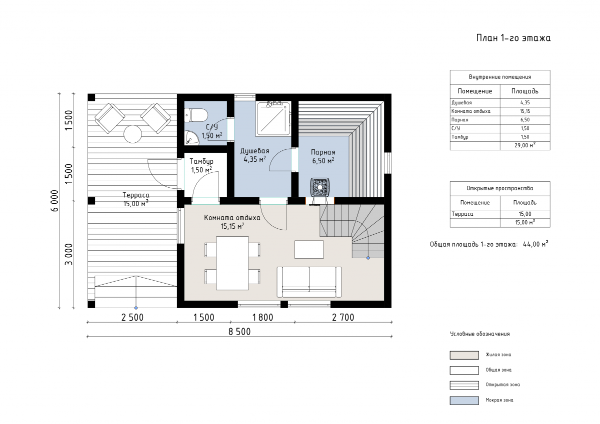 Общая площадь помещений — 57 м²: на первом этаже гостиная-столовая, парная, душевая, санузел, холл и тамбур, на втором — спальня и холл. Терраса 15 м² подходит для отдыха и общения на свежем воздухе.