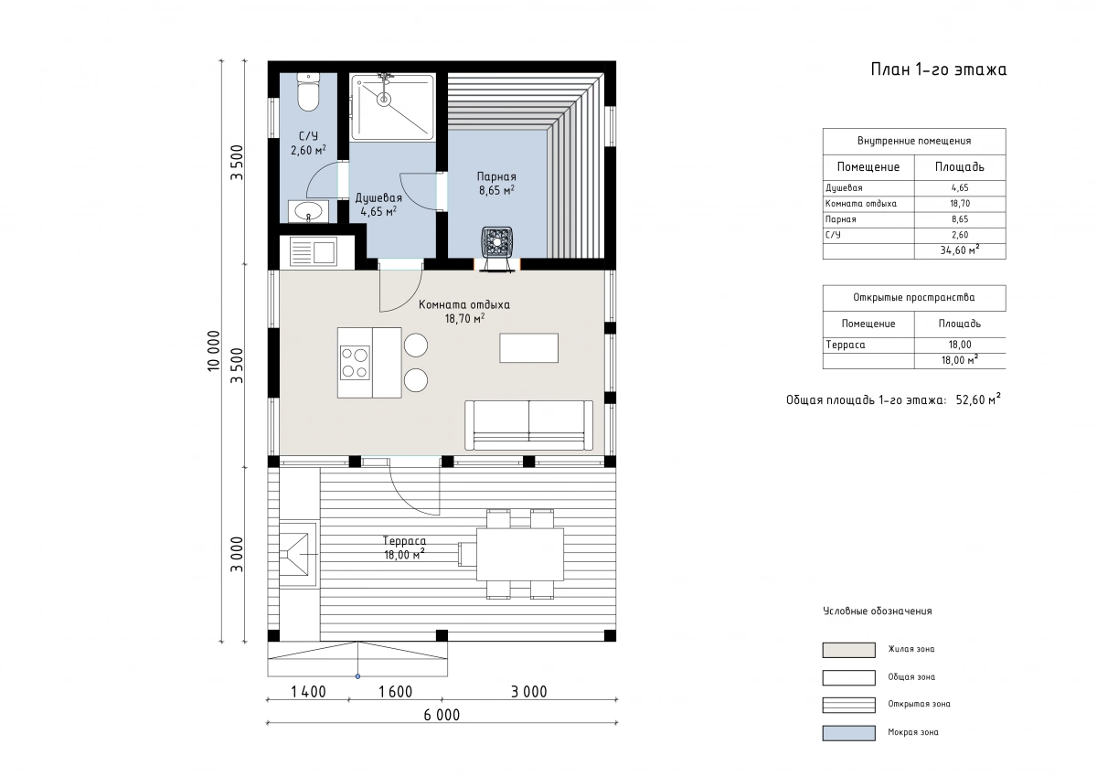Внутренние помещения занимают 35 м²: парная 9 м², душевая, санузел и уютная зона отдыха. Терраса дополняет баню, позволяя наслаждаться природными пейзажами в любое время года.