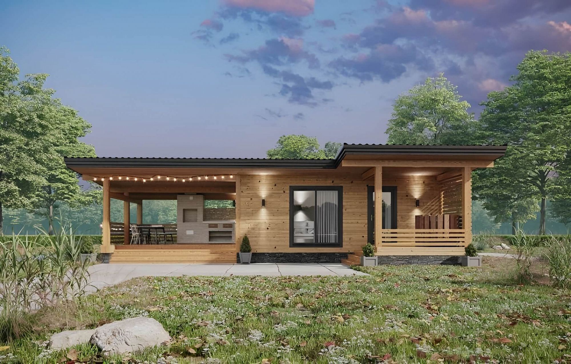 Этот метод строительства позволяет быстро возвести объект, при этом сохраняя отличные теплоизоляционные характеристики и долговечность. Архитектурный стиль проекта объединяет традиционные элементы финской архитектуры и современные акценты, создавая комфортную атмосферу для отдыха на природе. Основным преимуществом является продуманная планировка, включающая просторную комнату отдыха, баню и террасу для приятного времяпрепровождения. Внутренние помещения занимают 78 м²: комната отдыха, парная, душевая, санузел и техническое помещение. Открытые пространства — 26 м²: терраса для отдыха на свежем воздухе. Проект «Фоджа» станет отличным выбором для тех, кто ищет гармоничное сочетание функциональности и стиля для комфортного загородного отдыха.| Описание | |