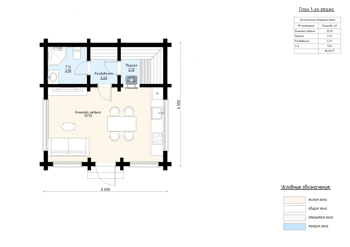 Вход в баню украшен небольшим крыльцом, а крупные окна открывают вид на участок, наполняя интерьер естественным светом. Благодаря компактным размерам (6х6 м), «Кингстон» гармонично впишется даже в небольшое пространство, создавая уютное место для отдыха в любое время года.
