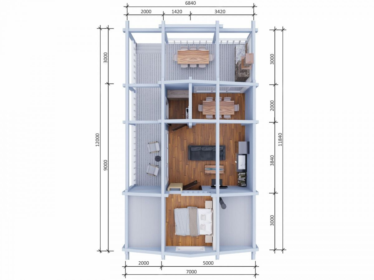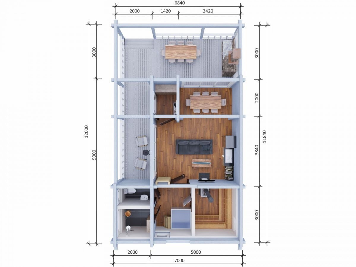 Просторная терраса с крытым навесом, стильные перила и натуральные материалы делают этот проект привлекательным для любителей классической русской бани. Внутреннее пространство организовано максимально удобно. Гостиная площадью 18 м² объединяет зону отдыха и обеденный стол, создавая уютную атмосферу для встреч с друзьями. Парная 6 м² оборудована классической печью, а рядом расположены душевая и санузел, обеспечивая комфорт после процедур. Открытая терраса 32 м² позволяет установить дополнительную зону отдыха с уличной мебелью или купелью. Встроенный каменный мангал станет центром семейных вечеров и встреч с гостями. Баня «Лахти» — это стильное и функциональное решение, которое гармонично вписывается в природный ландшафт и создает атмосферу уюта и расслабления.
