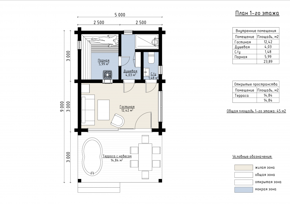 Проект сочетает в себе традиционный стиль деревянного строительства с современными решениями для комфортного отдыха. Просторная крытая терраса площадью 15 м² станет отличным местом для отдыха на свежем воздухе и дружеских посиделок. Внутреннее пространство организовано максимально функционально. Гостиная (12 м²) с панорамными окнами наполняет помещение естественным светом и создаёт атмосферу уюта. Парная (6 м²) рассчитана на 3-4 человека и оборудована всем необходимым для комфортного парения. Душевая (4 м²) позволяет охладиться после бани, а компактный санузел (2 м²) делает проект ещё более удобным для эксплуатации. Баня «Милуоки» – это стильное и практичное решение для загородного отдыха, где каждая деталь продумана до мелочей.