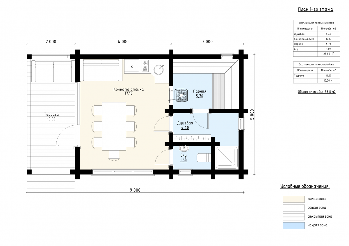 Внутренние помещения занимают 27 м²: просторная комната отдыха площадью 17 м², парная 6 м², душевая 4 м² и санузел создают удобное пространство для расслабления.