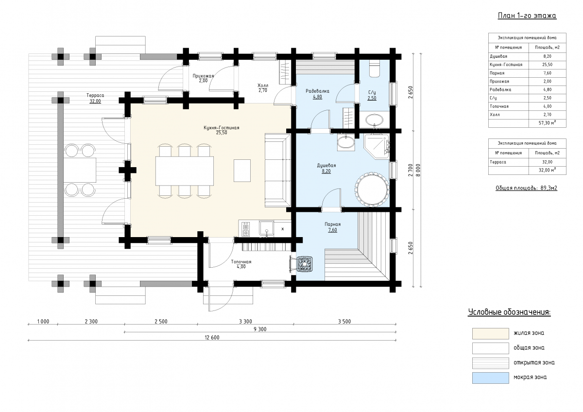 Общая площадь проекта составляет 89 м², что делает его отличным выбором для просторного участка и любителей комфортного отдыха.