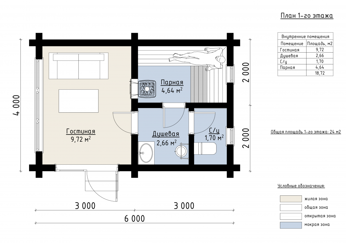 Размер строения составляет 6 × 4 метра, а общая площадь — 24 м². Планировка включает уютную гостиную (10 м²), парную (5 м²), душевую (3 м²) и санузел (2 м²). Все помещения продуманы до мелочей, чтобы обеспечить максимальное удобство при минимальных габаритах.