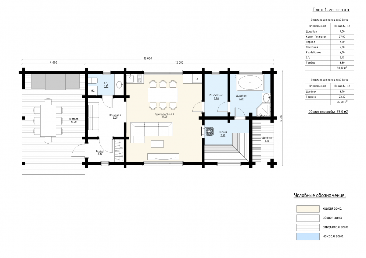 Общая площадь строения составляет 85 м², что позволяет разместить в бане просторную кухню-гостиную (27 м²), совмещённую с зоной отдыха. В бане предусмотрены все необходимые помещения для комфортного отдыха: большая парная (7 м²), душевая (7 м²), раздевалка (6 м²) и отдельный санузел (2 м²). На просторной террасе (23 м²) можно организовать обеденную зону или зону барбекю.