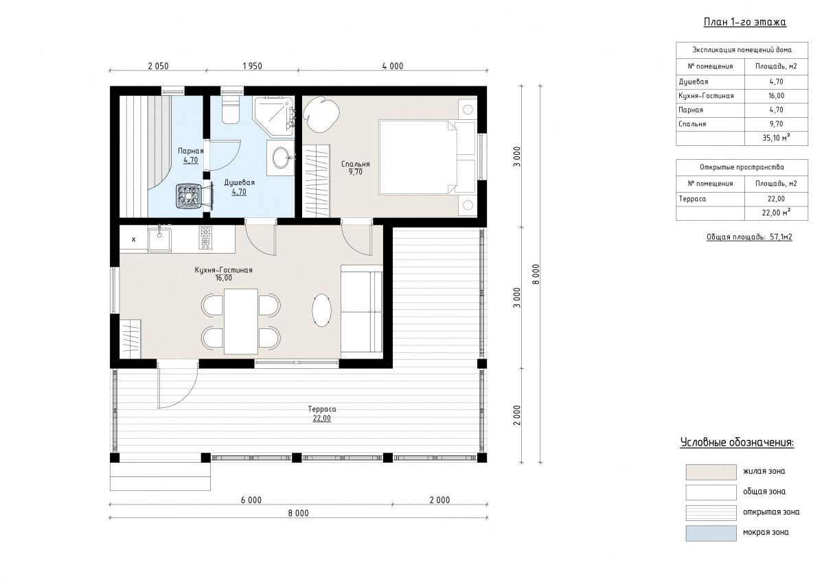 Баня строится из профилированного бруса, что обеспечивает отличную теплоизоляцию и экологичность. Площадь постройки составляет 57 м², включая просторную открытую террасу площадью 22 м², которая идеально подходит для летнего отдыха.