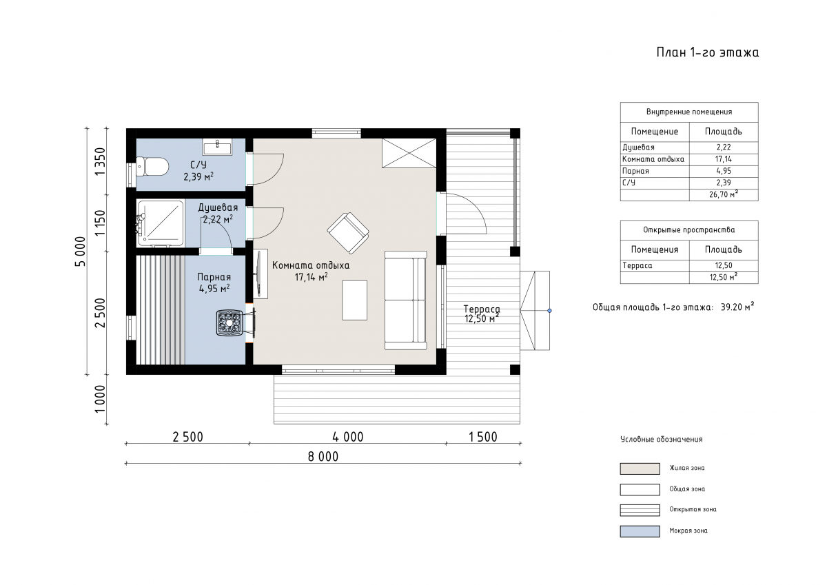 Внутренние помещения занимают 26,7 м², включая комнату отдыха площадью 17,1 м², парную 4,95 м², душевую 2,22 м² и санузел 2,39 м². Открытая терраса площадью 12,5 м² станет прекрасным местом для общения и расслабления после процедур.