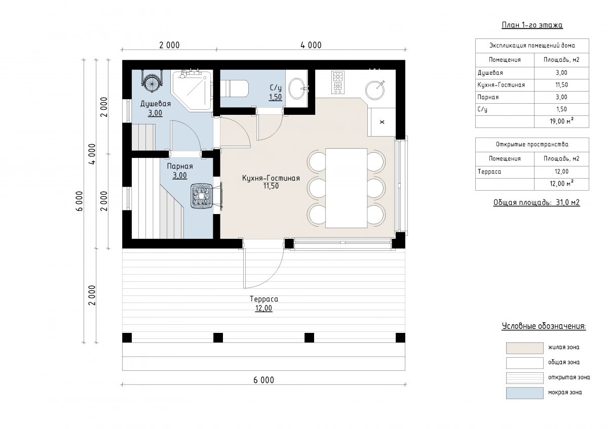 Общая площадь внутренних помещений составляет 19 м², включая кухню-гостиную 12 м², парную, душевую и санузел. Открытая терраса площадью 12 м² гармонично дополняет проект.