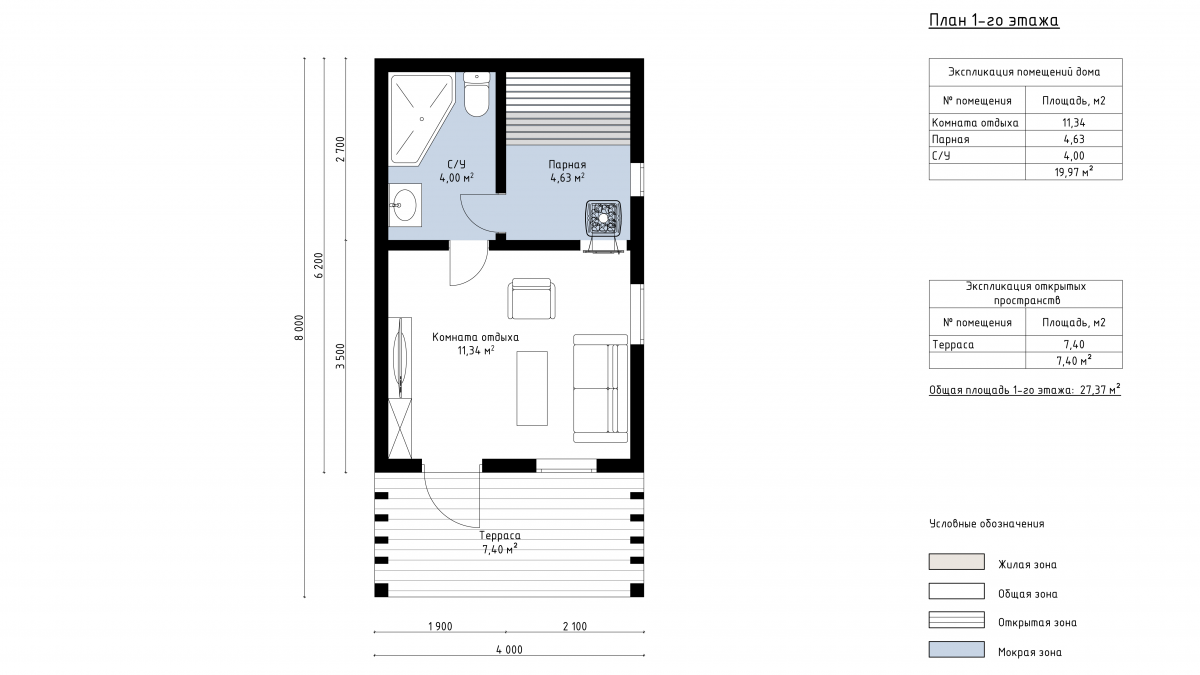 Общая площадь внутренних помещений — 20 м², включая комнату отдыха 11 м², парную 5 м², душевую и санузел. Просторная терраса 7 м² создает уютную зону для отдыха на свежем воздухе.