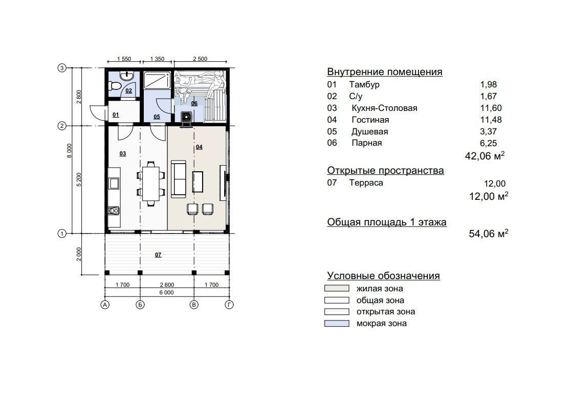 Баня выполнена из качественного древесного материала, крыша покрыта металлочерепицей. Общая площадь строения составляет 54 м², включая просторную террасу в 12 м². Внутреннее пространство организовано по продуманной схеме: зона отдыха (почти 22 м²) объединяет кухню-столовую и гостиную, позволяя комфортно проводить время с семьей или друзьями. Также предусмотрены душевая, санузел, парная и прихожая — всё необходимое для полноценного банного ритуала.