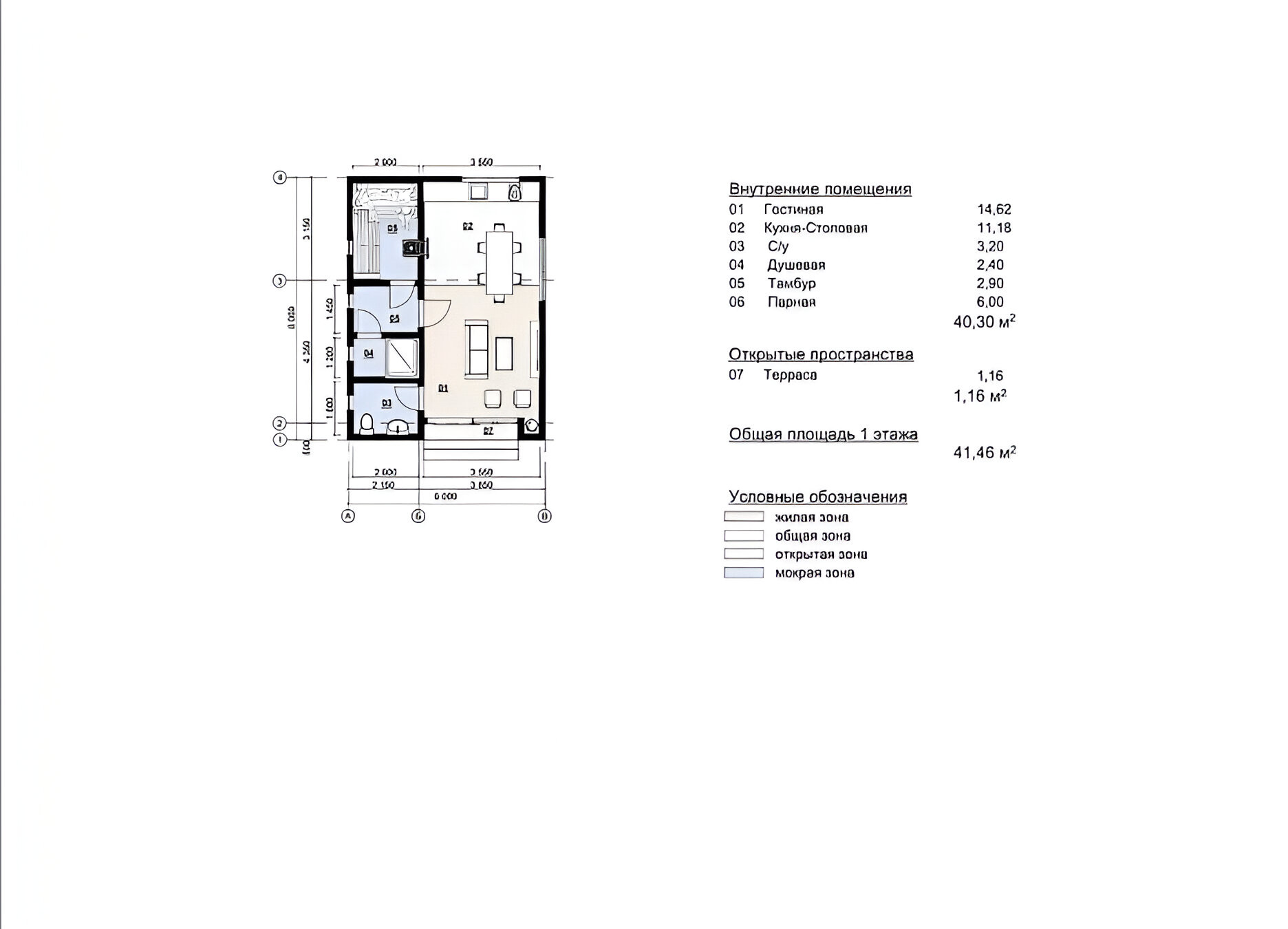 Выполнен в современном кубическом стиле с плоской крышей и панорамным остеклением. Основной материал постройки — профилированный брус, фасад отделан вертикальной деревянной рейкой, придающей постройке легкость и элегантность. Планировка бани включает все необходимые функциональные зоны. Внутри расположены гостиная (14,6 м²) и кухня-столовая (11 м²), санузел (3,2 м²), душевая (2,4 м²) и просторная парная площадью 6 м². Для отдыха на свежем воздухе предусмотрена терраса площадью 1,6 м². Общая площадь строения составляет около 41.5 м². Проект подойдет тем, кто ценит архитектурную простоту, эргономичную планировку и максимальную функциональность на небольшой площади. Идеально для семейного отдыха, аренды или размещения на территории эко-отелей.