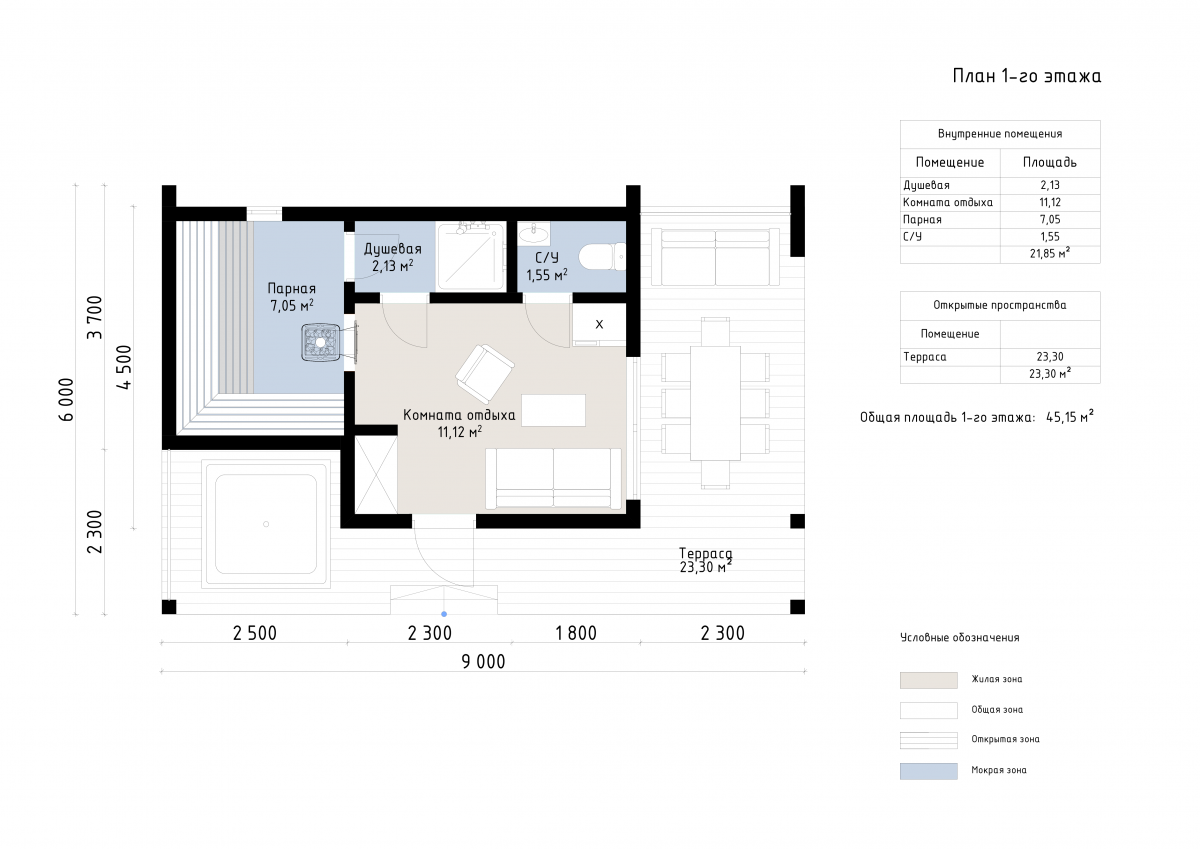 Проект сочетает в себе удобную планировку, современный дизайн и функциональные зоны для комфортного времяпрепровождения. Общая площадь бани составляет 45 м², из которых 22 м² занимают закрытые помещения, а просторная терраса добавляет 23 м² дополнительного пространства для отдыха на свежем воздухе. Внутри предусмотрена парная площадью 7 м², душевая 2 м², комната отдыха 11 м², а также компактный санузел 1,5 м². Благодаря панорамным окнам и темному фасаду в скандинавском стиле, баня органично вписывается в природный ландшафт. Просторная терраса 23 м² оборудована зоной для обеда и релакса, что делает проект идеальным местом для встреч с друзьями и семейных посиделок у костра.