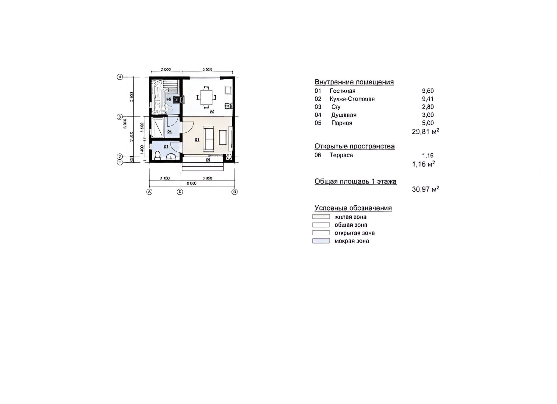 Благодаря строгим линиям фасада и натуральной деревянной отделке, баня гармонично вписывается в лесной или дачный ландшафт. Проект имеет габариты 6×6 метров и включает просторную террасу, идеальную для отдыха на свежем воздухе. Планировка площадью около 30 м² сочетает в себе всё необходимое: кухню-столовую (9.41 м²), гостиную (9.6 м²), душевую (3 м²) и полноценную парную (5 м²). Отдельная открытая зона — терраса площадью более 1 м². Баня продумана до мелочей: компактность не мешает комфорту, а функциональные зоны удобно зонированы. Проект подойдёт как для частного отдыха, так и для коммерческих задач в глэмпингах или банных комплексах. Cube 11 станет отличным выбором для одного или двух человек, ценящих уединение, стиль и практичность.
