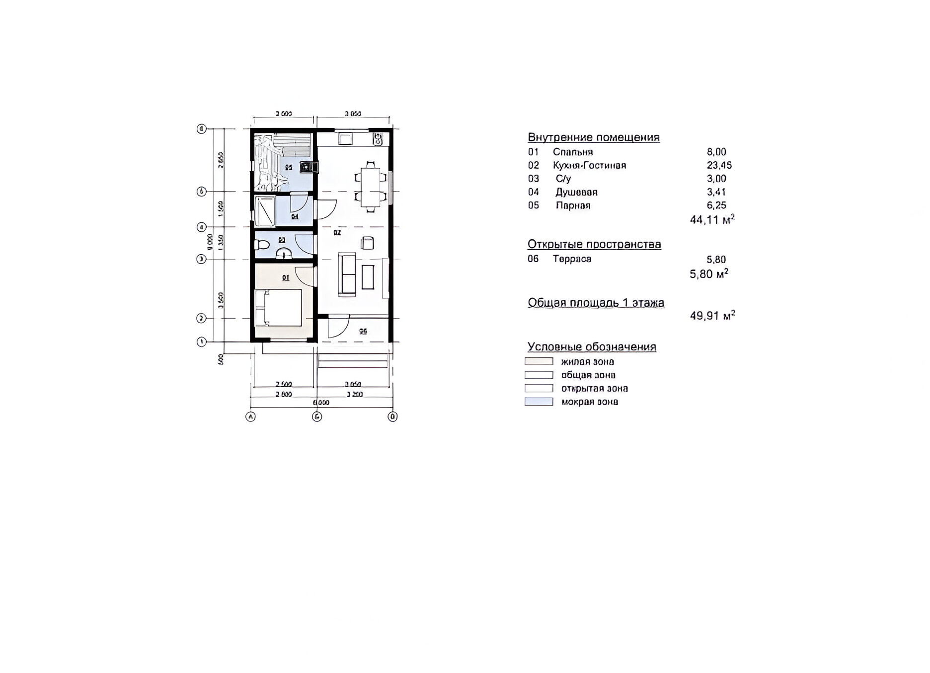 Фасад выполнен из натуральной деревянной обшивки с вертикальным рисунком, подчеркивающим геометрию здания. Размер бани составляет 6х9 метров, а общая площадь — почти 50 м². Проект идеально вписывается в лесной или дачный участок, не перегружая пространство. Планировка включает 2 основные функциональные зоны: жилую с кухней гостиной (около 23 м²) и спальней (8 м²), и «мокрую» зону с душевой (около 3 м²) санузлом (3 м²) и парной площадью свыше 6 м². Для комфорта на свежем воздухе предусмотрена терраса почти 6 м², которая подходит для установки шезлонгов или небольшого столика. Внутреннее пространство спроектировано с акцентом на эргономику и уют — максимум комфорта в компактных габаритах. Проект подходит тем, кто ищет практичную баню с выразительной архитектурой и минимальным строительным следом. Идеальный выбор для пары или небольшой семьи, ценящей эстетику и функциональность.