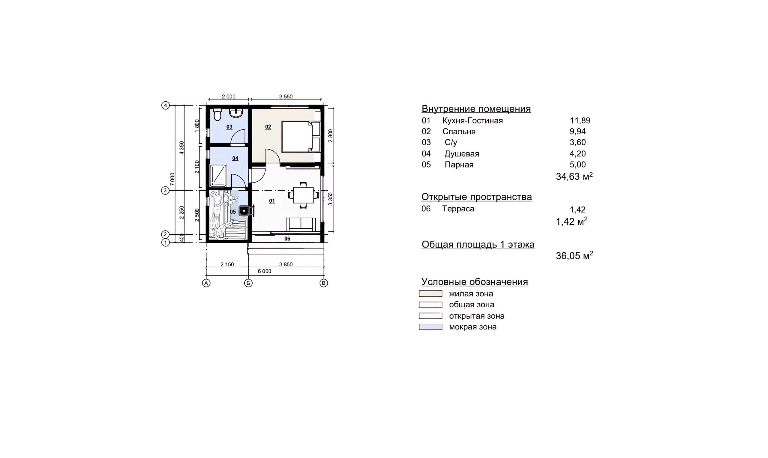 В основе конструкции — строгая геометрия, акцент на большие панорамные окна и натуральную деревянную отделку фасада, что делает баню гармоничной частью природного окружения. Размеры бани составляют примерно 6×7 метров, общая площадь — 36 м². Планировкой предусмотрены четыре основные зоны: кухня-гостиная площадью 12 м², спальня (10 м²), санузел с душевой и полноценная парная (5 м²) — каждая из которых функционально зонирована. Благодаря удачной организации пространства баня подходит как для личного отдыха, так и для приёма гостей. Проект идеален для тех, кто ищет компактное, но полноценное банное решение с возможностью отдыха и восстановления. Он подойдёт владельцам загородных участков, поклонникам современной архитектуры и тем, кто хочет использовать баню как часть бизнеса — например, для аренды или размещения в глэмпинг-комплексе.