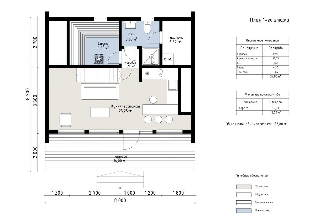 На первом этаже расположена просторная кухня-гостиная площадью 23 м², объединяющая в себе зону для приготовления пищи и зону отдыха. Рядом находится сауна (6 м²), обеспечивающая комфортные условия для парения. Также на этом уровне предусмотрен санузел (4 м²), техническое помещение (4 м²) и небольшой коридор (1 м²), соединяющий помещения. Дополняет пространство уютная терраса площадью 16 м², на которой можно установить шезлонги или стол для отдыха на свежем воздухе.